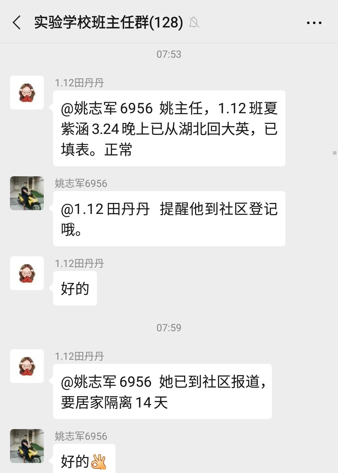 为了进一步做好疫情防控工作,我工作室各成员校坚持做好了学生健康情况、行程情况、现居住地每日日上报工作。各校领导、老师通过微信群、朋友圈、钉钉、公众号等平台,向家长广泛宣讲疫情防控政策,各校学生、家长以接龙方式每日在微信群里上报个人健康状况、现居住地、人员流动情况等重要信息,各校教师及时将这些信息汇总并上报。对于湖北籍学生,或疫情期间去过湖北或湖北返乡学生,则单独做好追踪、上报工作。