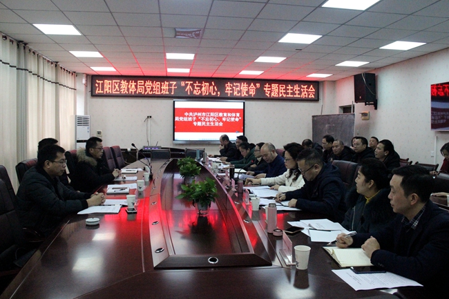 12月23日,泸州市江阳区教育和体育局党组班子“不忘初心,牢记使命”专题民主生活会在区教研培训中心召开。区政府副区长罗勇,区委主题教育第二指导组副组长、区委宣传部机关党委书记李宗蔺、区纪委监委驻区委宣传部纪检监察组组长王葭、区政协教科卫体委员会副主任范永东出席会议,局机关中层及以上干部、部分学校支部书记列席会议。会议由区教育体育局党组书记、局长周玉主持。