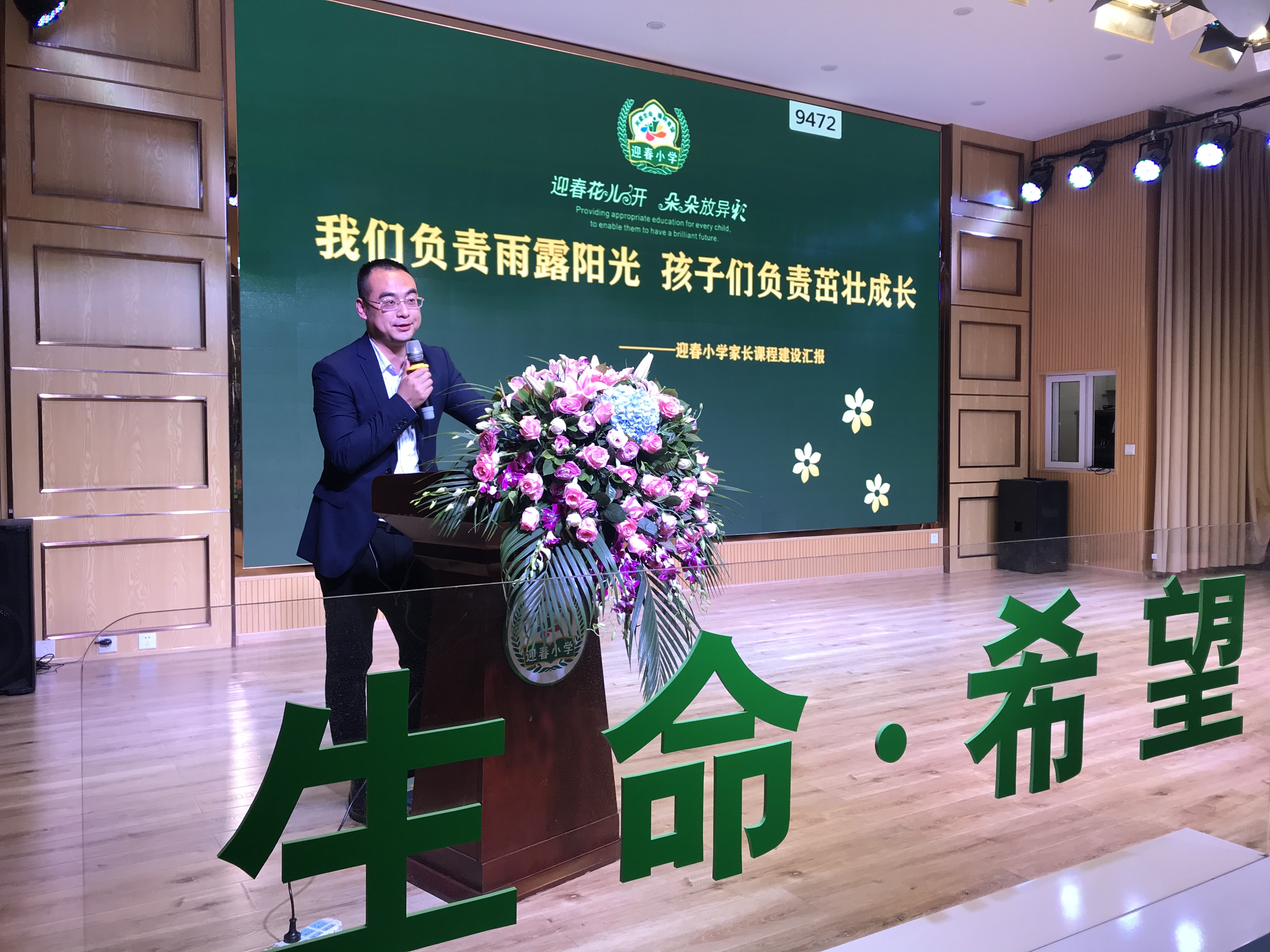 万志强校长发表致辞,他首先肯定了迎春小学各级家委会成立至今为学校做出的贡献。宣布了在一系列家校共育的举措下,2021年3月迎春小学被评为成都市家庭教育示范学校的喜讯。为保障家庭教育工作的顺利开展,迎春小学不仅分级成立了家委会,还成立了家长学校,建立了家长学校的规章制度。迎春小学将继续秉承"春天教育"的办学理念,还原教育的本真,回归教育的原点,以生命和希望为核心,遵循为每一个生命的成长提供适合教育的指导思想,以坚持培育热爱生命、满怀希望的智慧灵动的新时代好少年的育人目标,不断夯实学生全面发展与个性发展取得显著成绩。万校长指出,随着未来人才培养多元化的挑战,家校共育关系也在发生着深刻的变化,学校充分意识到新时代赋予家庭在家庭教育指导中的特殊地位和责任,创建新型家校共育关系,是持续影响孩子健康成长和学校高质量发展的重要因素。迎春小学始终将家庭教育纳入学校的总体规划和重点工作推进。基于家庭教育的复杂性和特殊性,万校长呼吁家长要共同学习,与学校精诚合作,培养孩子正确的价值观,培养孩子与社会自然和谐相处的能力,家长要以身示范,努力创建优良的家风、家训和和谐温暖的家庭氛围。