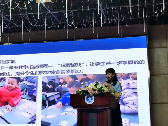 学校教师发展中心主任、数学与思维课程处负责人樊小娟代表数学与思维课程处做了题为《快乐与数学同行 智慧随思维同行》的汇报。樊主任主要从课程设计规划、课程体系构建、课堂研究内容、课堂实施等方面对“怡思数学”进行了详细介绍。樊主任的介绍展示了“怡思数学”如何引领孩子构建快乐的“思维图”。