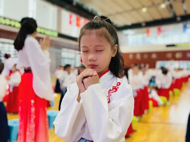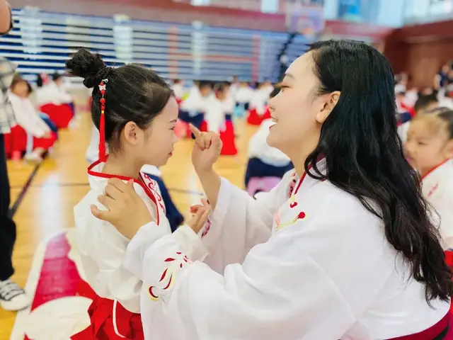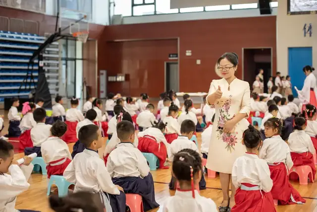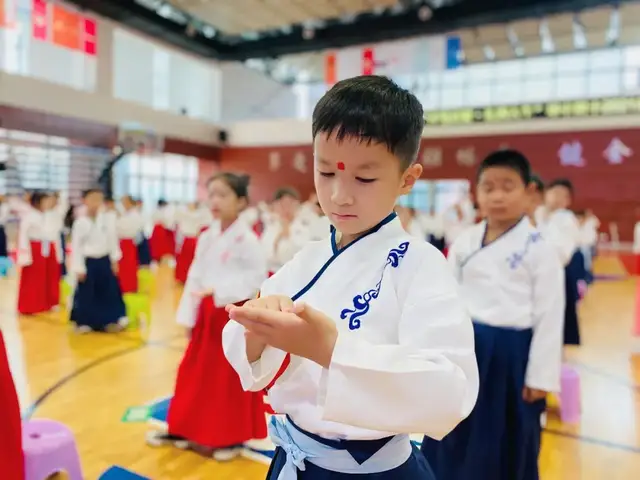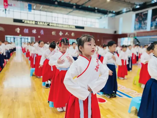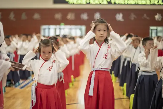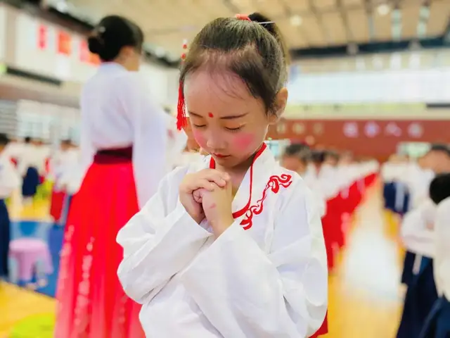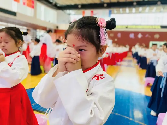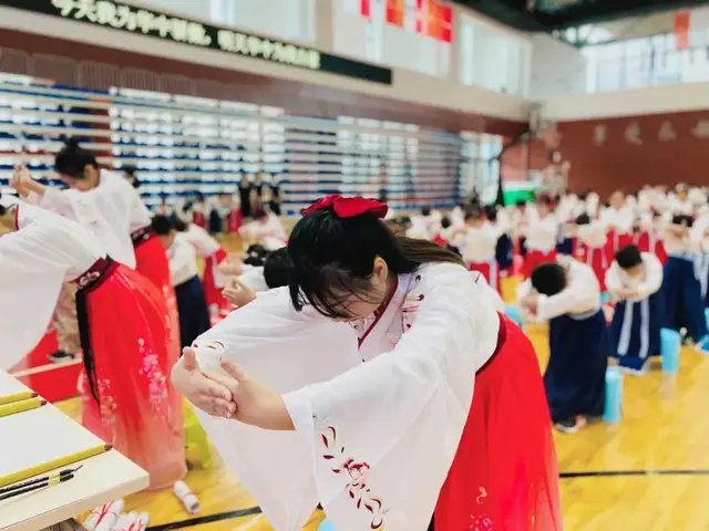 拜师长,做知书达理的好少年。男生左手在前,女生右手在前,双手交叠,向下三拜,一拜先师孔子;二拜启蒙恩师教我读书、教我习礼、诲人不倦;三拜同学,三人行必有我师,岁月同窗、挚爱互帮。古风浓厚的仪式,让孩子们不忘传统,传承中华优秀礼仪,发扬尊师重教精神。