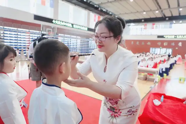 开笔礼分为正衣冠、拜师礼、朱砂启智、击鼓明志、启蒙描红、许心愿树梦想、老师颁发证书七大环节: