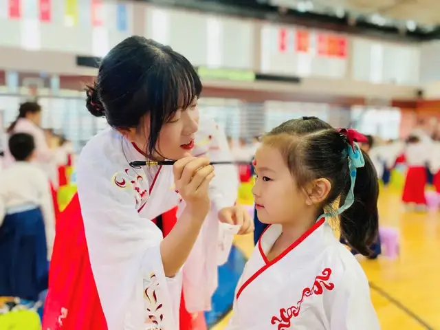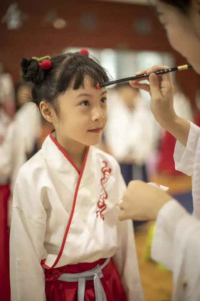 朱砂启智寓意开启智慧,目明心亮,高校长俯下身笑盈盈地为孩子点痣,老师们也手持沾有“朱砂”的毛笔,在学生眉心处点上一个红痣,因为“痣”和“智”同音,寓意孩子从此开启了智慧,寄望孩子们从此心明眼亮,好读书,读好书,从此成为一个有智慧的人。
