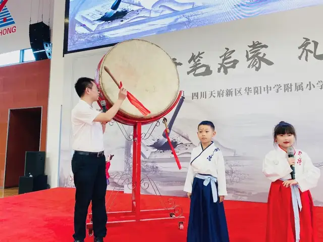 古人勤学有志向,今日儿郎树理想。华中附小校长助理邹继光带着一年级新生击鼓三声。每一声鼓声都孕育着一个崭新的希望,昭示着一年级小朋友从此破蒙。