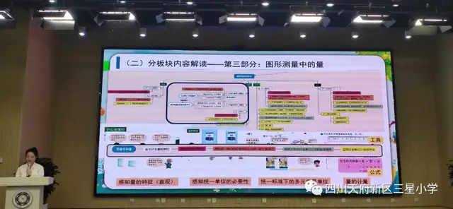 胡跃庆老师结合“量感”的概念,对“量与计量”的知识图谱从整体上进行详细解读,并结合教材实例沟通了知识点与思维生长点有效衔接。