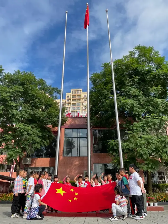 伴随着雄壮的《义勇军进行曲》,五星红旗冉冉升起,在空中随风飘扬。一二年级的萌娃们,充满渴望和自信的眼睛在国旗下更加明亮。