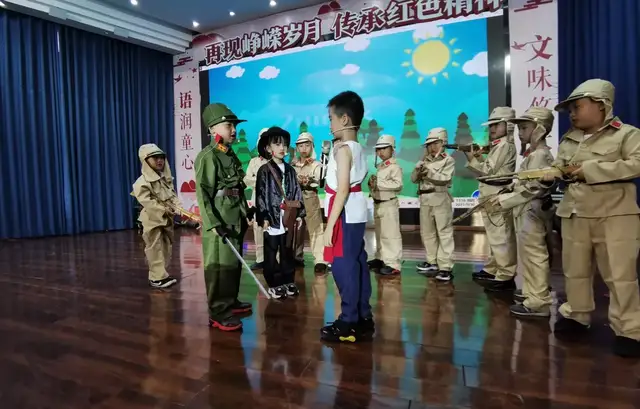 “忆往昔,五千年沧桑岁月,山水雄浑;看今朝,七十年筚路蓝缕,太平盛世。” 长眠的英雄啊,你们用鲜血与生命凝固了岁月不老的痕迹。远逝的画面,化作尊尊雕像与丰碑,烙印为每一个中华儿女不朽的记忆。接下来是四年级带来的《红领巾的故事》,少先队员与八路军同仇敌忾、军民一心被小朋友们演绎得淋漓尽致、惟妙惟肖。