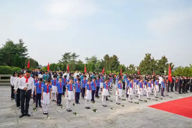 演唱结束后,区委、区人大常委会、区政府、工人代表、学生代表等上前整理缎带。秋日的阳光从树缝间投射而下,墓园幽静而和煦。现场全体人员手持鲜花,依次有序瞻仰烈士纪念碑,祭扫烈士墓,并向烈士纪念碑敬献鲜花,表达崇敬之情。
