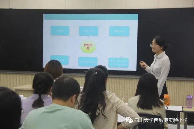 四川大学西航港实验小学综合楼四楼数学解读会场,参赛教师对每册教材的数与代数板块进行了详细解读,从数学课程标准整体要求出发,对本册教材数与代数板块板块的单元目标、教学重难点、易错点、拓展点等方面进行了详细解读。参赛老师们准备精心、解读深入。