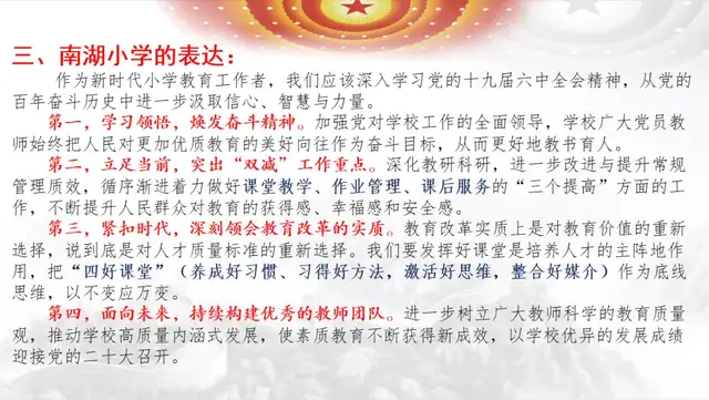 11月23日,南湖小学党支部开展11月固定党日活动,集中认真学习了党的十九届六中全会精神,全体党员参会。