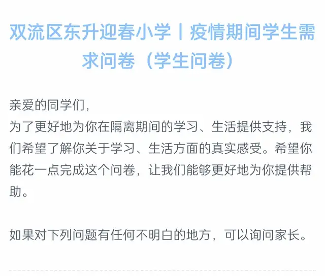 学校为给隔离学生在隔离期间的学习、生活提供更好的支持,通过“疫情期间学生需求问卷调查”收集学生在学习、生活中真实地感受和需求,制定相应举措。