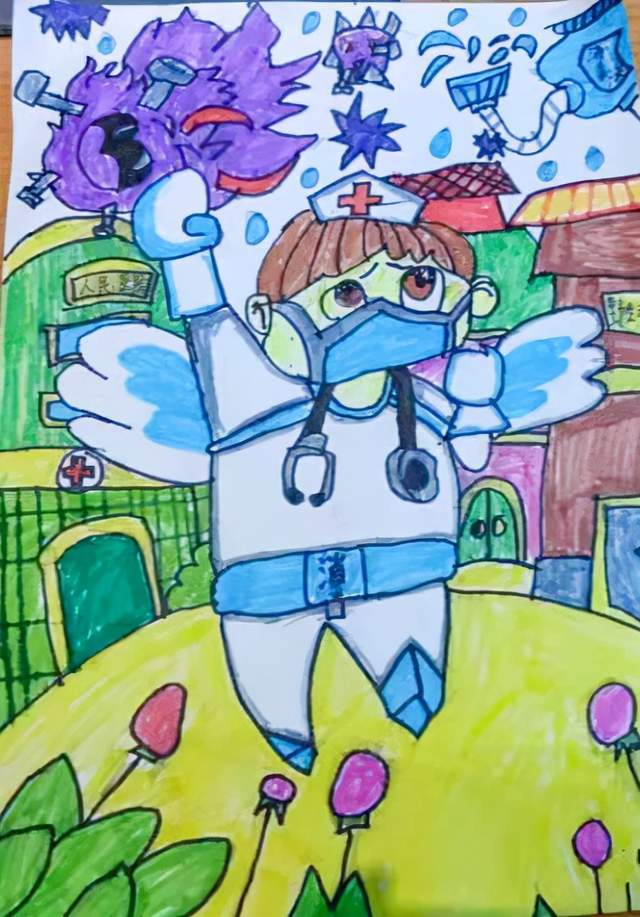 你瞧,美术课上,孩子通过绘画诉说“童心抗疫,画里有话”的纯真愿望,把它送给最爱的人。