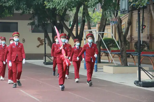 英姿飒爽的国旗班护卫队迈着矫健的步伐,走向升旗台。当雄壮的《义勇军进行曲》响起,升旗手振臂一挥,鲜艳的五星红旗迎风招展,冉冉升起。全体师生肃然而立,向五星红旗行注目礼,齐声高唱国歌,表达着对伟大祖国母亲的无限热爱和诚挚祝福。