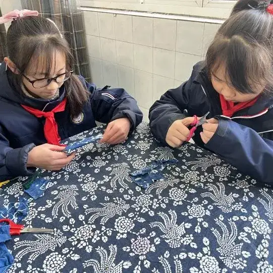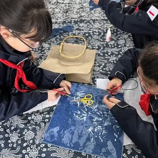 第二节是由华阳实小詹贵川老师带来的《蜡染》。蜡染艺术在我们少数民族地区世代相传,经过悠久历史发展,形成了独特的民族艺术风格。通过一段学生制作蜡染的微课,孩子们学习、了解蜡染的工艺流程。并对蜡染如何运用到文创产品中进行思考。实操环节,清晰明了的微课,让孩子们学会通过剪、粘、缝等技法将蜡染元素运用到发夹、耳饰、书签等物品中去。孩子们在动手制作过程中,体会到蜡染艺术是中国传统艺术瑰宝,感受我国历史文化的美感。