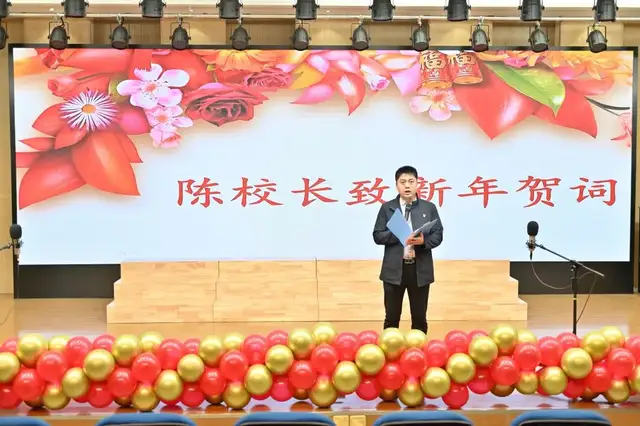 元旦庆祝活动正式开始,校长陈锋代表黄甲小学向全校师生,向关心支持学校发展的家长朋友们致以新年的祝福。