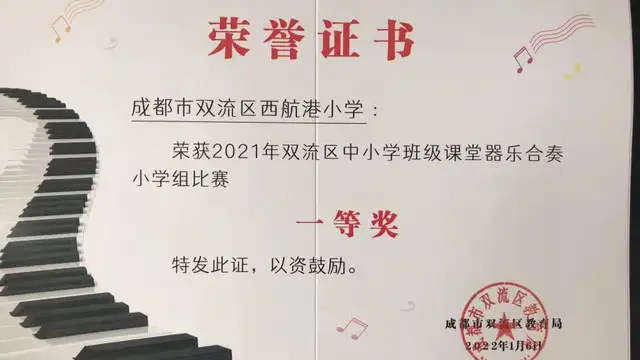 2021年12月,西航港小学竖笛社团参加“2021年双流区中小学班级课堂器乐合奏比赛”荣获全区小学组第三名、一等奖的好成绩!
