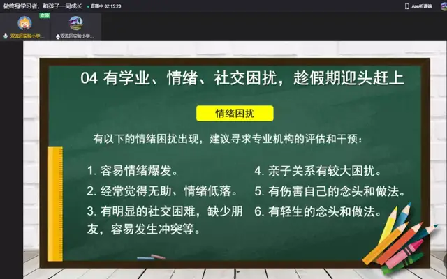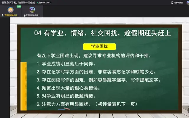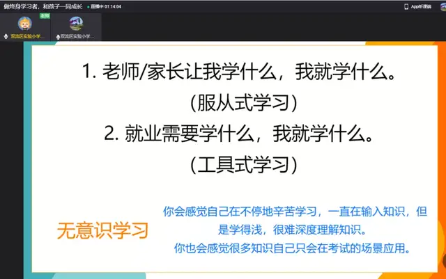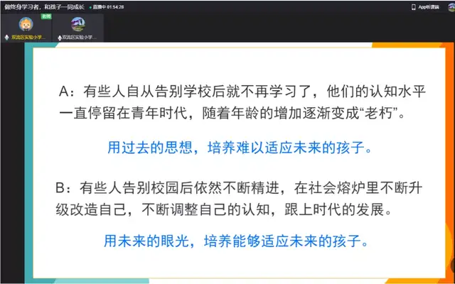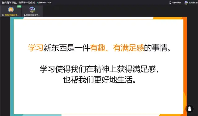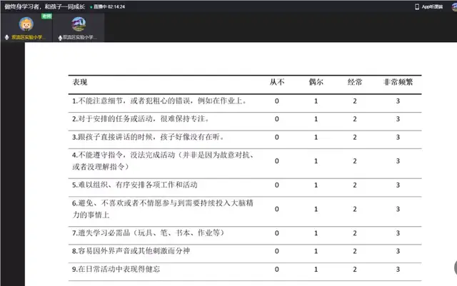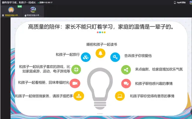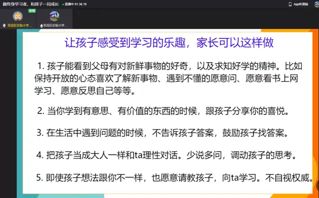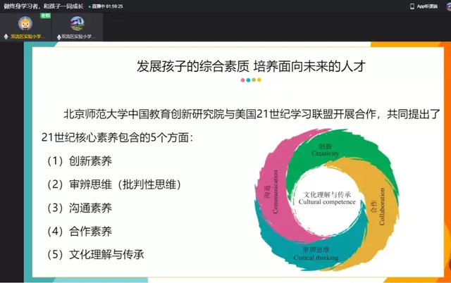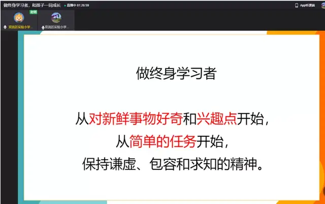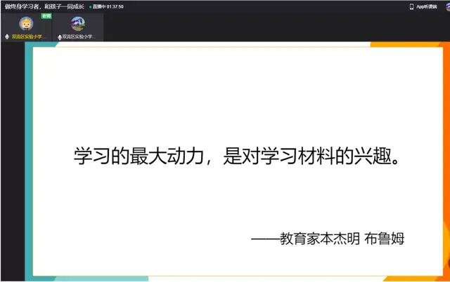 一学期的时光转瞬即逝,期末之际,新年伊始,为进一步加强学校与家庭、家长与老师之间的亲密联系,帮助形成家校合力,提高育人成效。双流区实验小学外国语学校于2022年1月8日召开了主题为“做终身学习者,和孩子一同成长”的家长会。本次线上家长会由董校长主持,主讲人是小圆桌成长咨询课堂的曾苏尧老师。