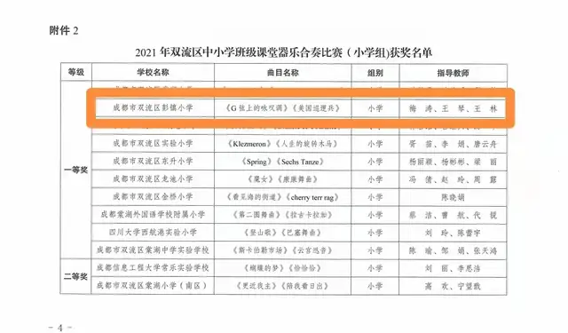 2021年12月,成都市双流区彭镇小学木笛乐团在梅涛、王琴、王林老师的辛勤指导下,孩子们用自信、默契、和谐的精彩表演,再摘2021年双流区中小学班级课堂器乐合奏比赛一等奖桂冠。