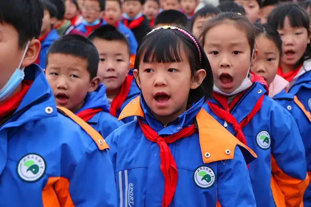 孩子们穿着整齐的校服,戴着鲜艳的红领巾,昂首挺胸,精神抖擞。