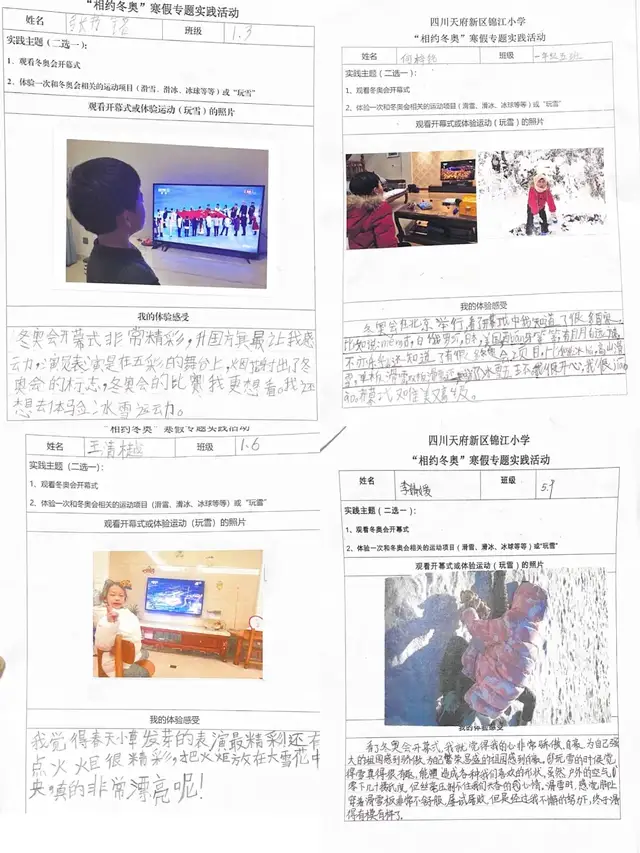 为弘扬奥林匹克精神、增强运动意识、提升综合素养,在寒假期间锦小学子们开展了一系列“相约冬奥”专题实践活动,孩子们通过观看冬奥会、体验冬奥会相关运动项目、助力冬奥会手抄报或绘画的形式,学习了运动健儿们的运动精神和优秀品质,深深感受了冬奥会的魅力。