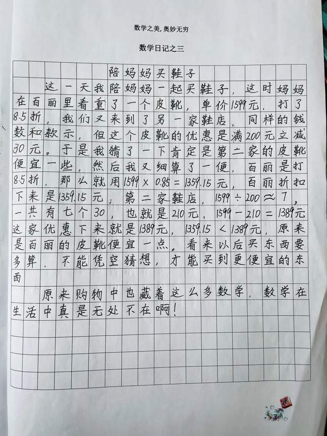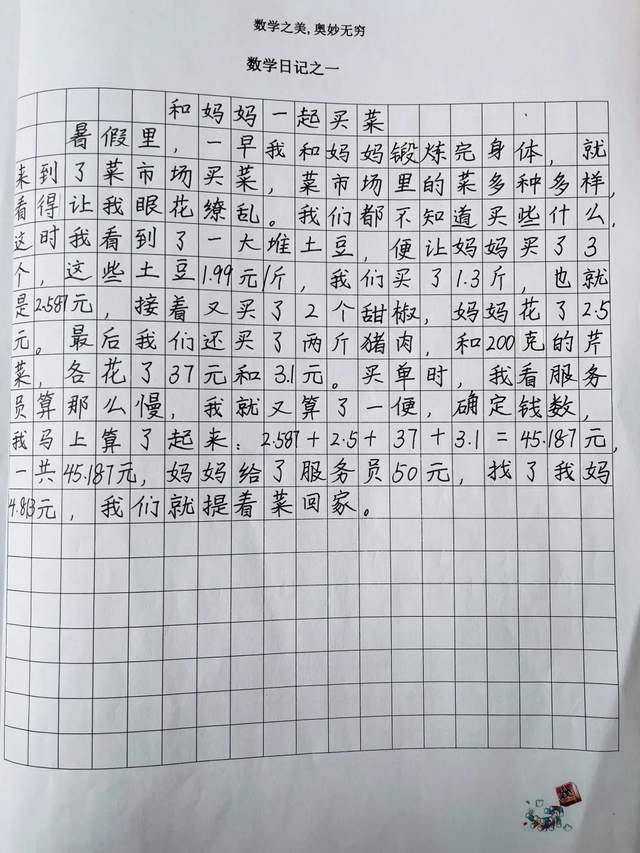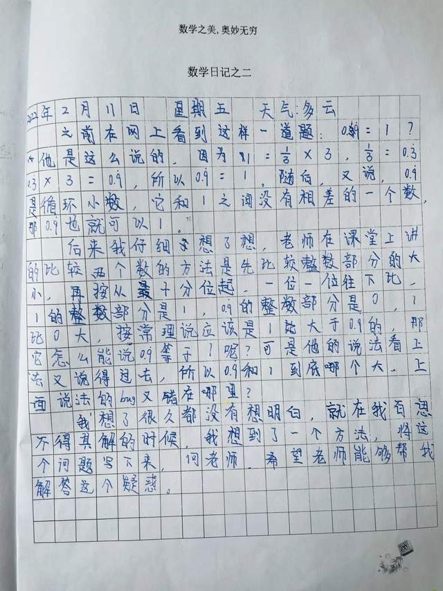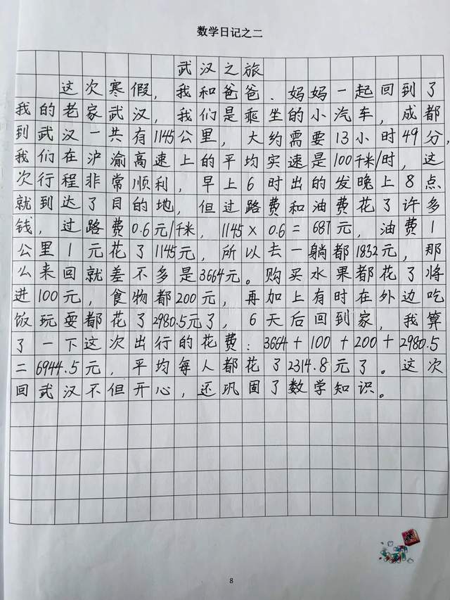 写数学日记就是把看到的、听到的、想到的、亲自体验到的与数学有关的内容记下来,让我们一起来看看寒假期间五年级孩子们体验到了哪些与数学有关的内容吧!