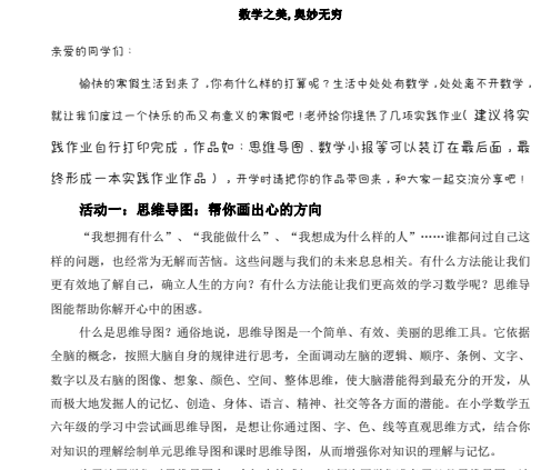 为了全面贯彻并落实国家提出的“双减”政策,实现主题实践作业“多样化,形式趣味化,内容丰富化”的多彩育人目标。成都市双流区西航港小学五年级数学组的老师们精心设计了“数学之美 奥妙无穷”的五年级数学寒假实践作业。