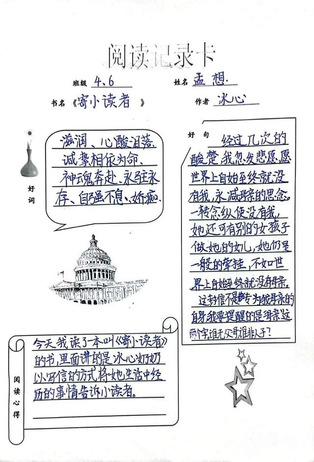 书香沁心,笔墨流芳,读书笔记,镌刻思想。一本本小书虫阅读卡,记录着孩子们课外阅读的收获,他们用手中的笔书写着阅读所带来的芳香和甘甜。