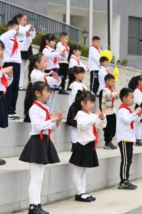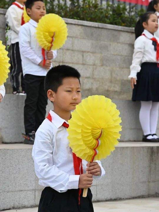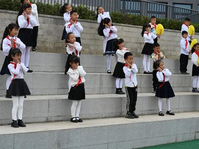 “清明时节雨纷纷,路上行人欲断魂”,身着白衣,手持“金菊”,鲜艳的红领巾飘扬在胸前。二(一)中队全体少先队员以一首《清明》为开场,用和谐美好的舞姿传递了清明的庄严肃穆。