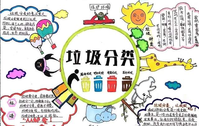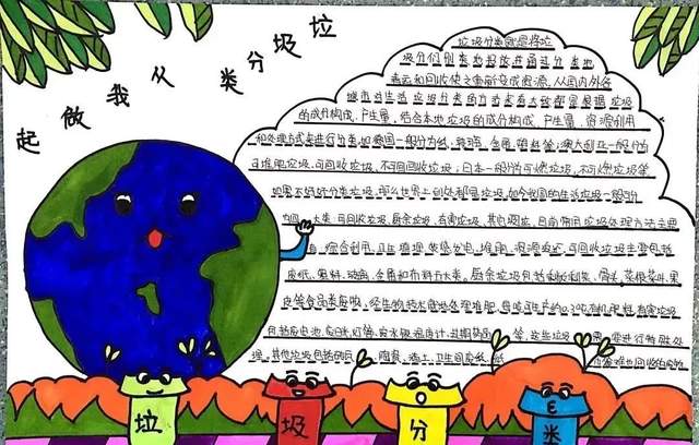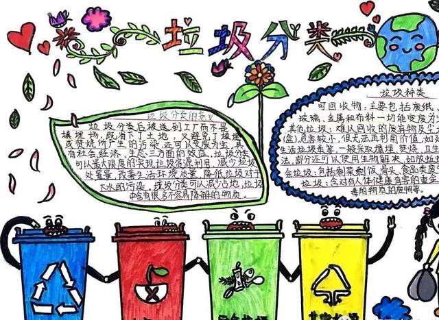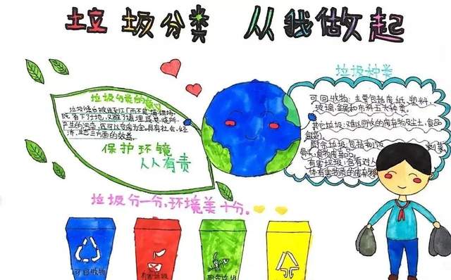 同学们的手抄报图文并茂,细心绘制,倡导大家垃圾分类、保护环境。