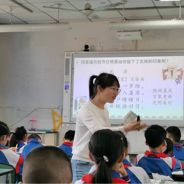 三.三班罗宇老师给大家带来了《古诗三首》的《元日》。课程结构清晰,学法指导完善。从解诗题、知作者入手,从而读古诗、明诗意,最后想情景、感氛围。《元日》整节课,课堂气氛活跃,学生和老师互动,学生和老师互动,大家共同进步,脸上笑容不断。