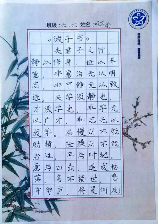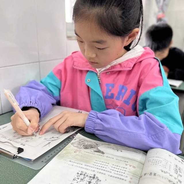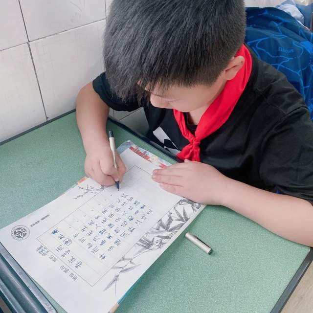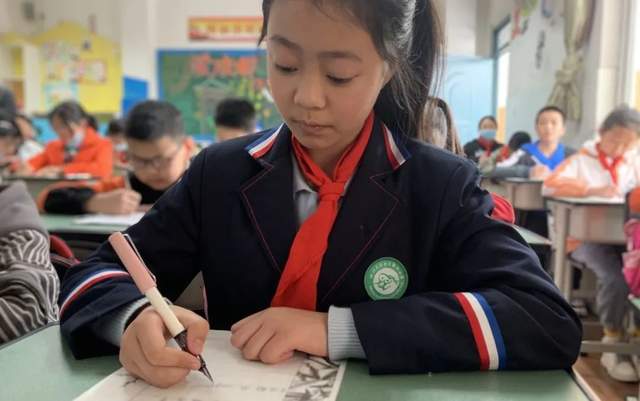 在各班语文老师组织下,孩子们正襟危坐。一、二年级孩子们的铅笔字入格到位,一点一提一丝不苟,横平竖直堂堂正正。三至六年级学生的钢笔字虽无大开大合之势,亦有跃然纸间之美。