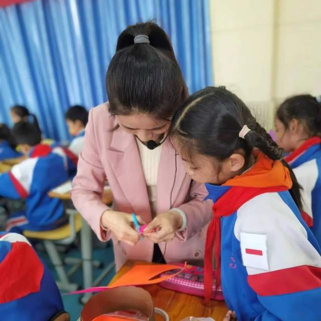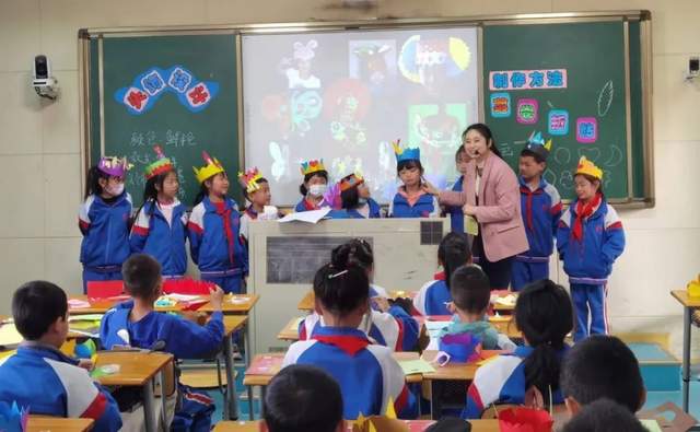 张老师指导学生欣赏图片,学习头饰的用途和了解头饰的悠久历史,探究发现头饰帽圈的制作方法,学生认真观察,用心感悟,确定帽圈的大小。经过对比分析后,发现头饰除了帽圈还缺少装饰设计,让学生观察分析,探究出课本中学生的作品是利用了卷折,粘贴,剪挖,穿编等方法,为后期的设计环节增加灵感来源。最后,展示评价了学生的作品,孩子们在互相点评的过程中学习总结了制作方法和设计心得,感受生活的情趣,体验创作的乐趣。