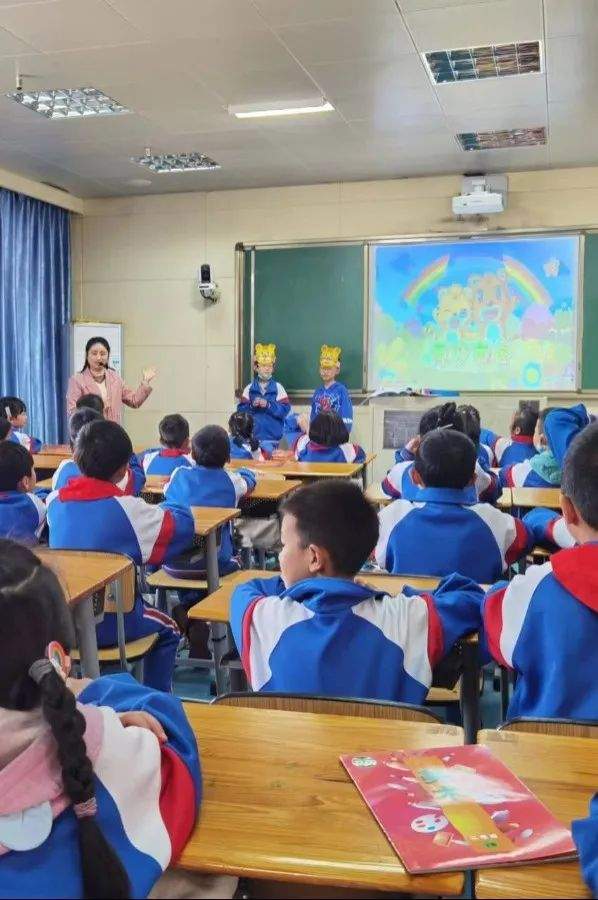 美术老师张丽带领着二年级三班的同学来到了《头饰设计》课。课前张老师邀请两位同学戴上老虎头饰随着音乐舞蹈,带领学生很快进入课堂情境,感受音乐中的动物形象,为教学营造氛围。