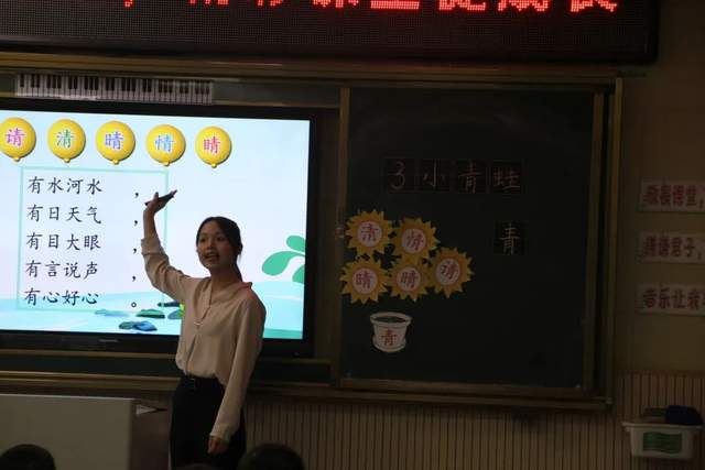 本次教研活动,首先由代雨弟老师执教一年级语文课《小青蛙》,充满青春朝气的代老师,思维敏捷,让人眼前一亮。整个课堂教学环节清楚,识字方法多样落实,课件也制作美观,让人赏心悦目。