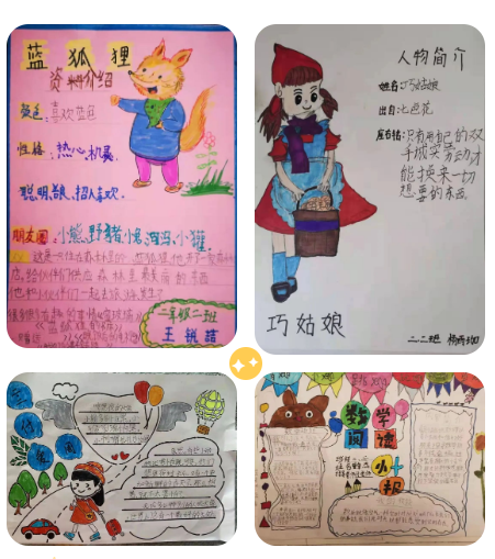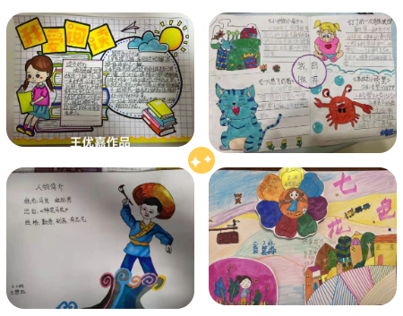 读完一本书,我们会随着时间而淡忘。为了促进孩子们深度的阅读,各种阅读笔记、阅读小报、人物卡片等形式,可以让学生梳理自己的阅读体验,训练阅读思维。让每一朵花开,是每一位老师的心愿,在制作的过程中孩子们人人参与,各自发挥自己的特长,收获的不单单是阅读体验,也训练孩子们整理资料、创新创造的能力。从“珍妮”到“马良”,孩子们明白了什么是善良与正直,从李白到王之涣,孩子们背的是他们诗,写下的是自己的情怀,从唐僧到关羽,他们看到的是故事背后人物的坚定……小小的纸,五彩的画,黑色的铅笔下,记录着孩子们内心的喜欢与感动。