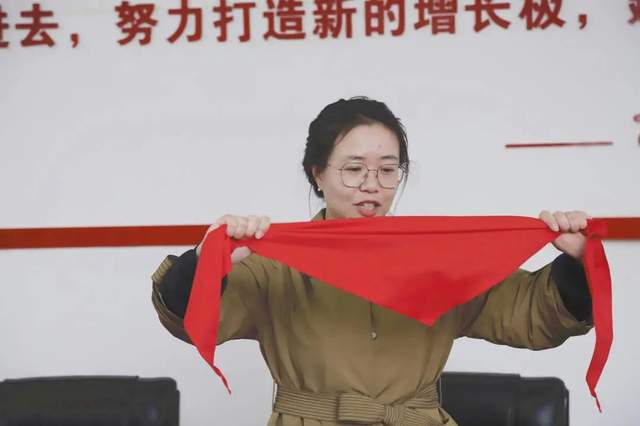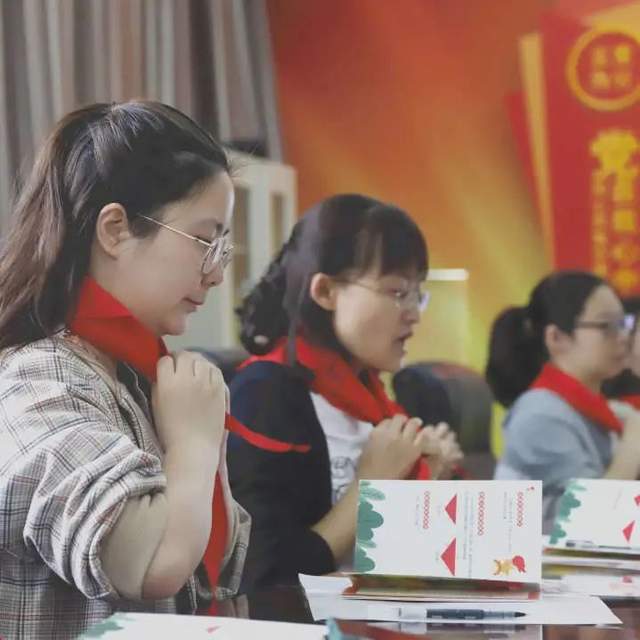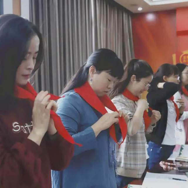老师们在钟老师的带领下认真佩戴红领巾