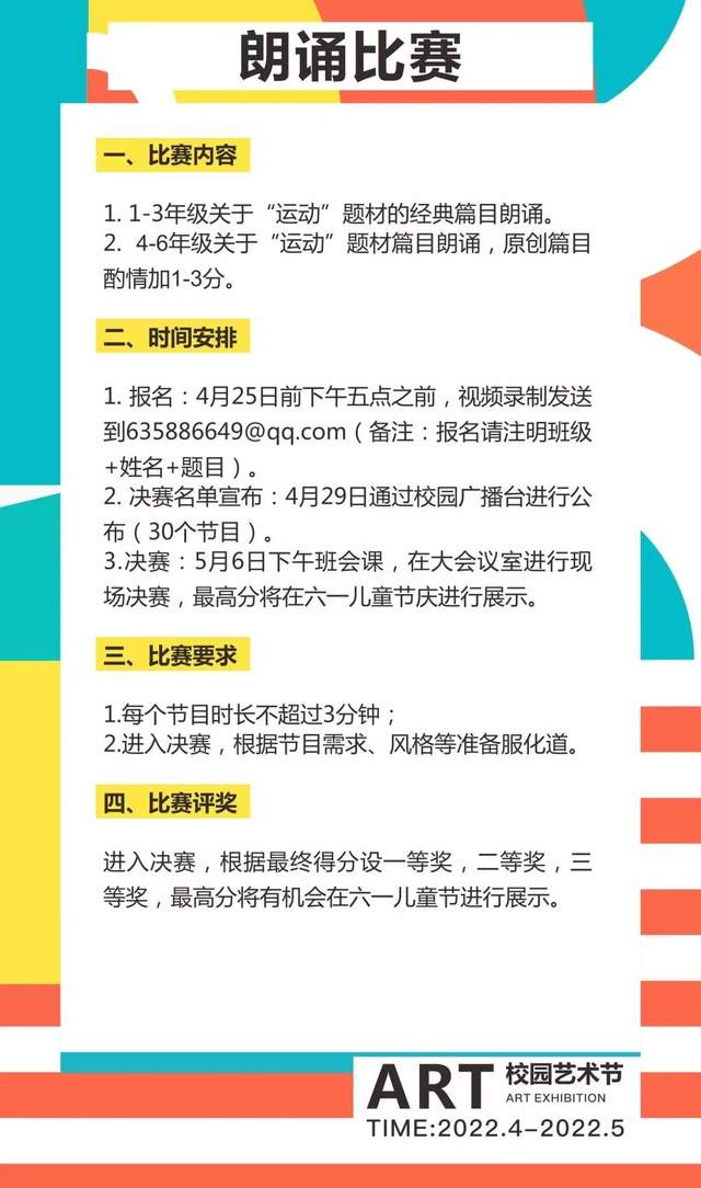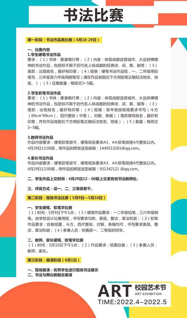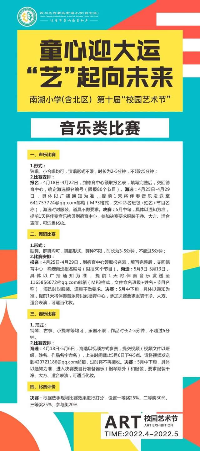 为进一步贯彻“五育并举”,推进“五育融合”,丰富孩子们的校园文化生活,培养学生积极健康的审美情趣和良好的艺术修养。秉承美育普惠、搭建展示平台的原则,2022年4月,四川天府新区南湖小学“第十届校园艺术节正式”拉开序幕。今年的艺术节活动设置了以下几大项目,欢迎同学们、家长们积极参与哟……