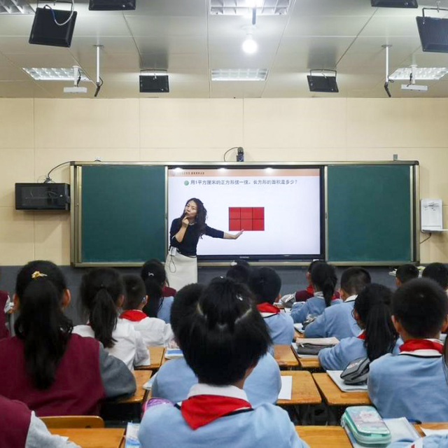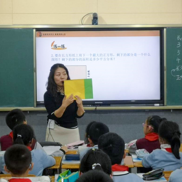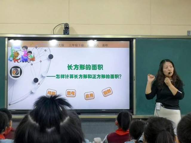 在工作站成员张莉老师执教的《长方形的面积》一课中,张老师根据学生实际情况,充分挖掘教材,以学校即将开展的“五人足球赛”活动为主线,通过摆一摆、填一填、想一想,多角度探索长方形(足球场)面积的计算过程,在实践操作中积累活动经验。张老师利用多媒体等现代教育教学手段引导学生积极思考,整个课堂学生积极参与其中,在活动中高阶思维能力得以提高。