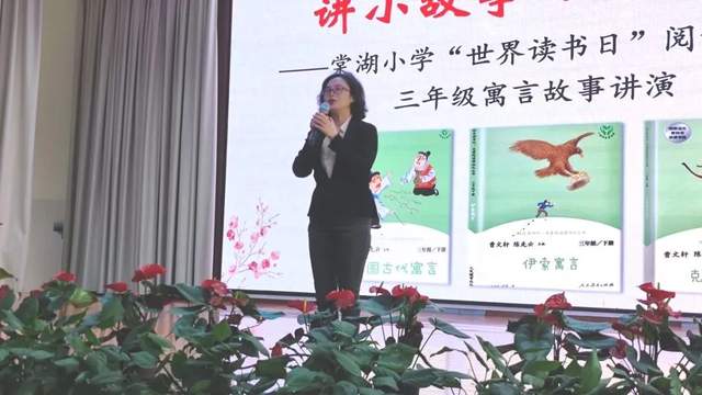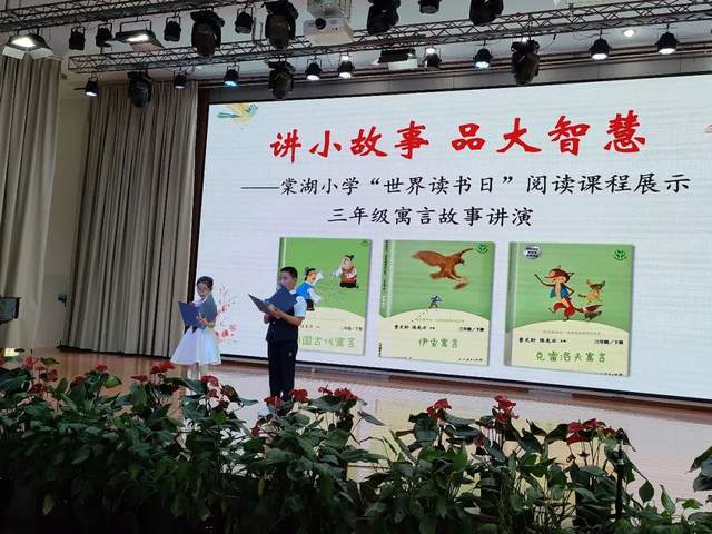 有趣的故事犹如一副画卷,明丽的色彩伴着奇特的幻想,游荡在脑间,久久不能忘却。在多姿多彩的故事中,我们聆听花开的声音;在想象奇特的故事里,我们感受梦幻的气息。在这万物复苏、春意盎然的季节,为了给学生提供舞台,展示才能,再现经典寓言故事的魅力,4月21日上午,棠湖小学“世界读书日”阅读课程展示之三年级寓言故事讲演比赛在棠湖小学多功能厅隆重举行,棠湖小学校长李顺榕、副校长雷朝丽、教务处主任温文勤、信息技术处主任徐捷、教务处副主任孟秦及棠湖小学三年级全体师生参加了此次活动,本次活动由3.8班滕东阳同学和3.9班何施淼同学主持。