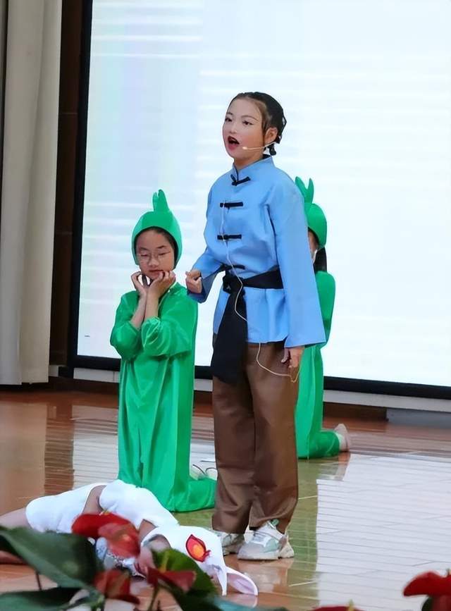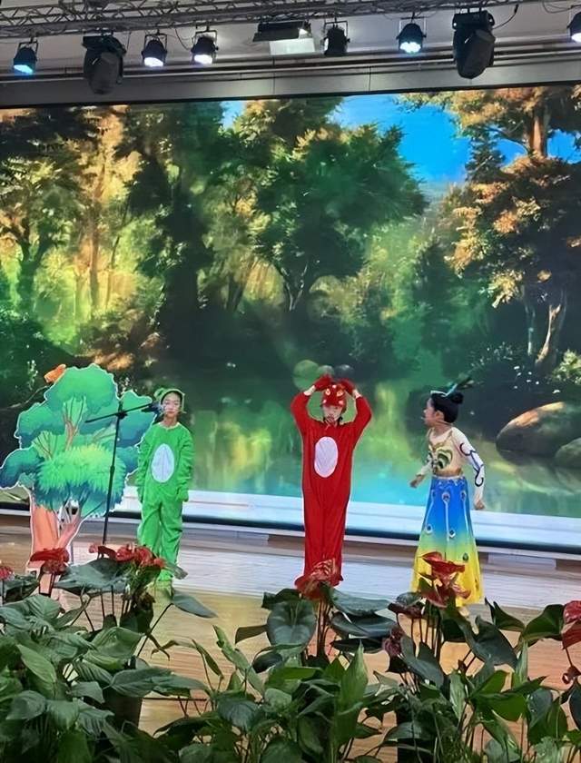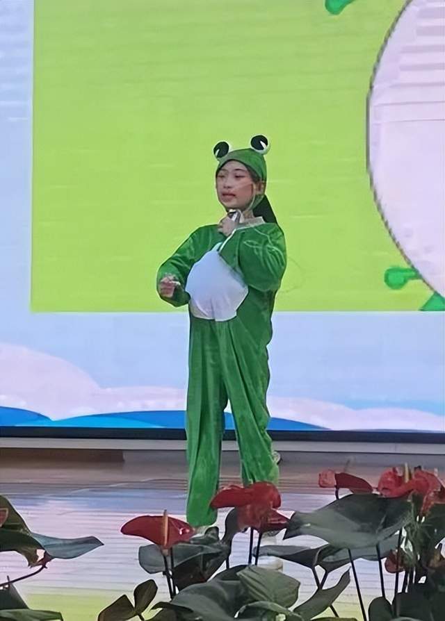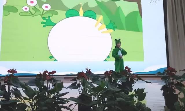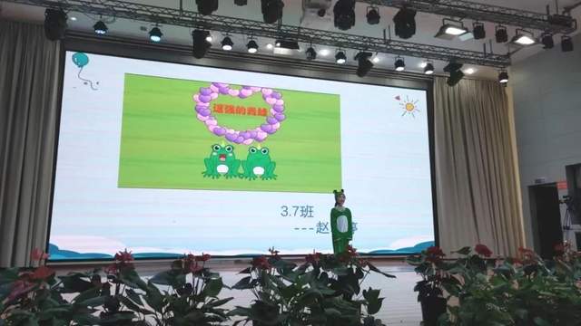 3.7班同学扮演的青蛙可有趣啦,这是一只爱逞强的青蛙,它最大的本领就是吃害虫,不过有时候也喜欢炫耀自己。惟妙惟肖的表演可把台下的观众们逗得笑声不断。