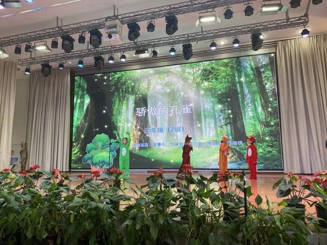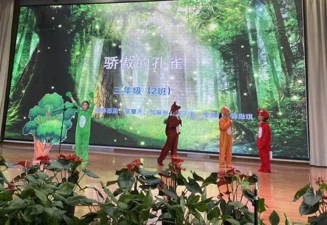 孔雀拥有绚丽多彩、光彩夺目的羽毛。一只骄傲的孔雀会遇到什么事?3.2班同学的演绎把大家也带入了森林王国:孔雀的骄傲、动物朋友的善良,最后动物们的和谐相处。稚趣却不稚嫩的表演,让台下小观众们也为之欢呼。