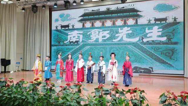 转眼来到古色古香的宫廷,打扮讲究却不通音律的南郭先生妄想在宫廷生活里浑水摸鱼,最终仍是落得被识破的下场。3.4班的同学将自己对滥竽充数的理解融入到表演《南郭先生》中去,配上新颖的现代音乐,牢牢抓住了同学们的视线。