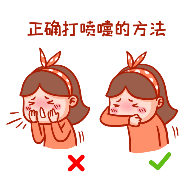 如果来不及准备纸巾,可弯曲手肘,用手肘处的衣物遮掩口鼻,尽量避免直接用手遮掩口鼻。
