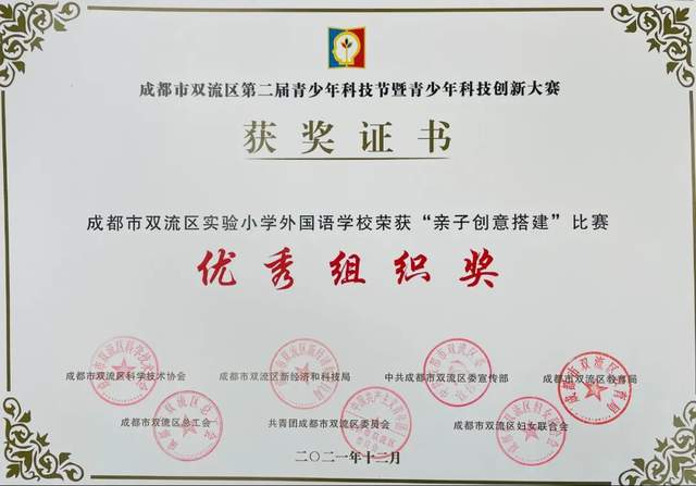 成都市双流区实验小学外国语学校荣获“亲子创意搭建”比赛优秀组织奖。