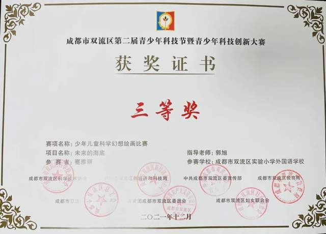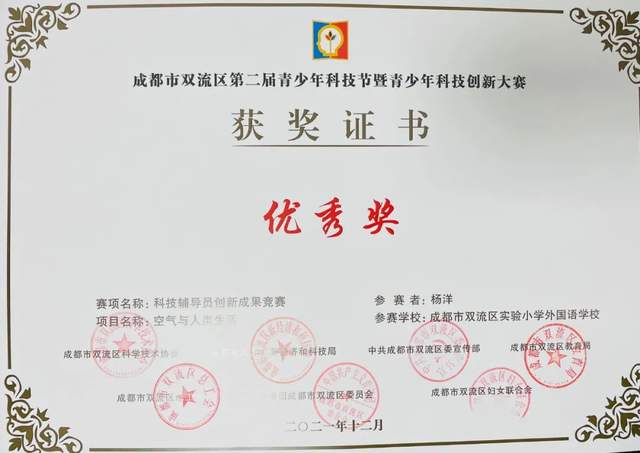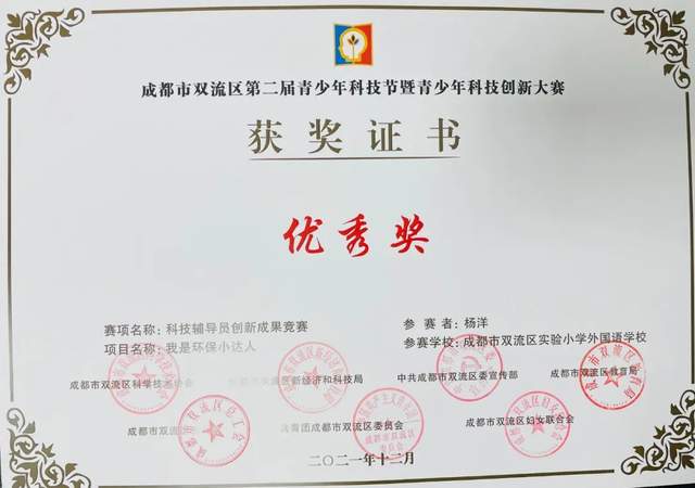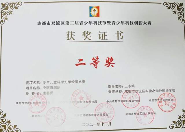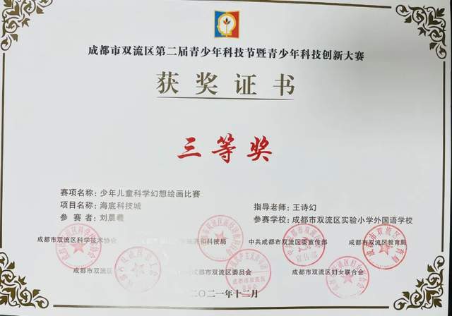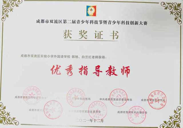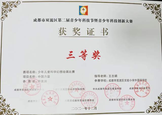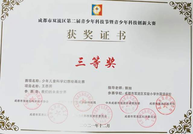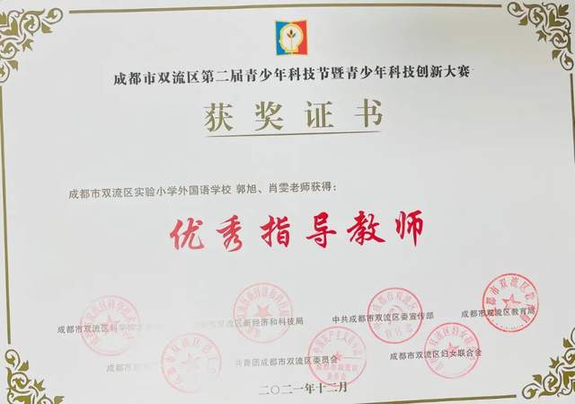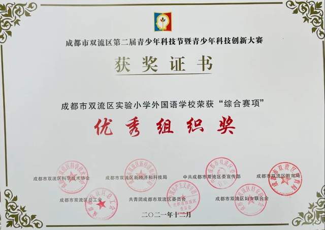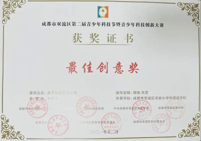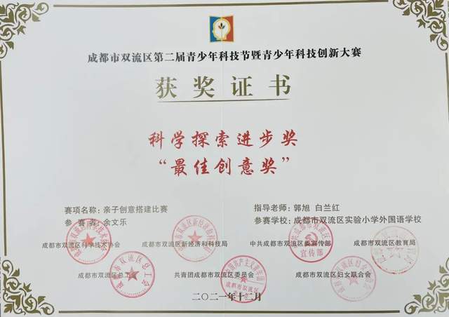 喜报!喜报!成都市双流区实验小学外国语学校在2021年成都市双流区第二届青少年科技节暨青少年创新大赛“童心向党·科技筑梦”活动中,荣获傲人成绩!我校荣获科技节“综合赛项”优秀组织奖和“亲子创意搭建”比赛优秀组织奖!余文乐、于思恒、颜铭意在亲子创意搭建比赛中获奖;唐馨悦、王思雨、刘晨羲、蹇雅丽、尹美涵在少年儿童科学幻想绘画比赛中获奖;江彦瑾、伍栩江在青少年科技创新成果竞赛中获奖;杨洋老师获得科技辅导员创新成果竞赛优秀奖;郭旭、白兰红、肖雯老师获得优秀指导教师称号。