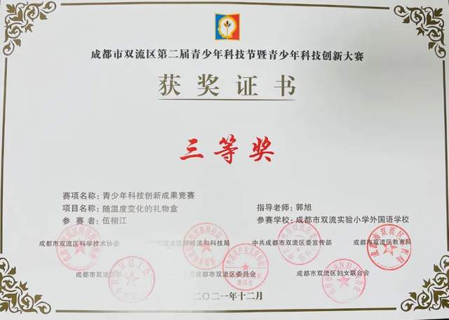 伍栩江凭借作品《随温度变化的礼物盒》获得青少年科技创新成果竞赛三等奖。