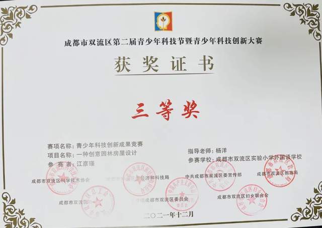 江彦瑾凭借作品《一种创意园林房屋设计》获得青少年科技创新成果竞赛三等奖。