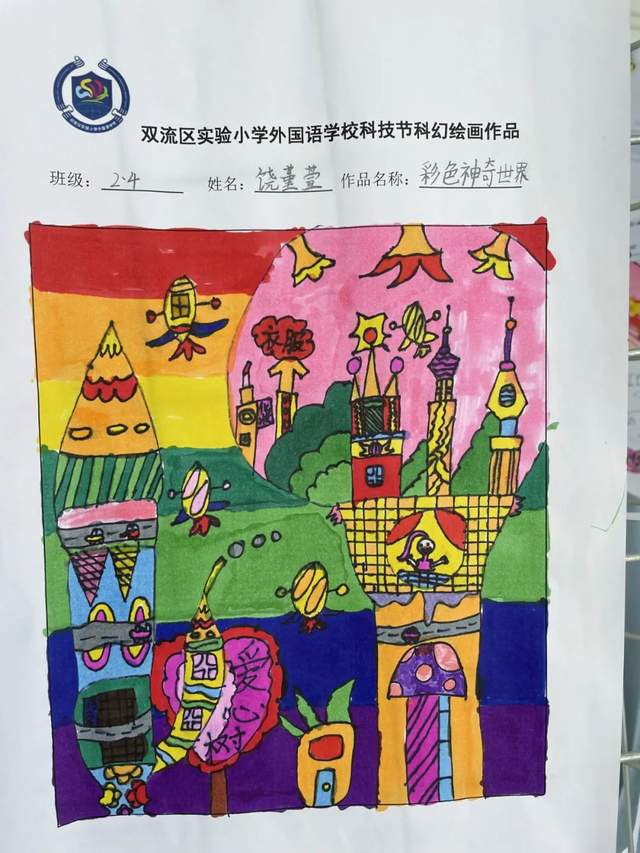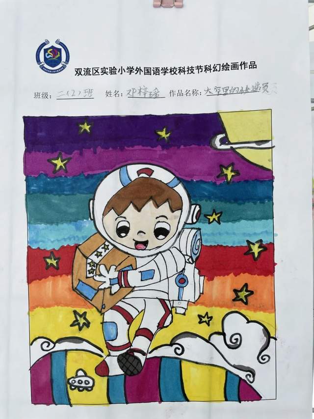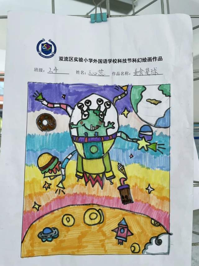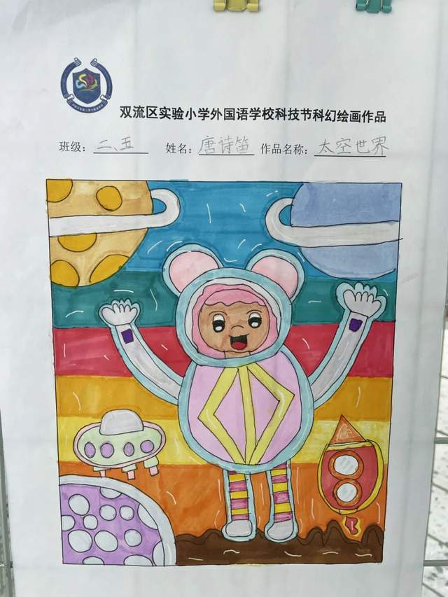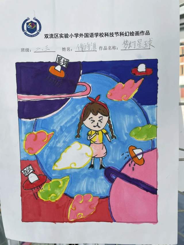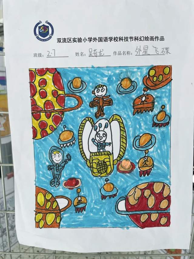二年级的孩子们则是妙笔生花,在“奇妙科幻画”主题下彰显着自己独特的科技创想。画面中有星球的快递员,有未来世界,也有奇妙的快乐城等具有丰富想象力的蓝图。