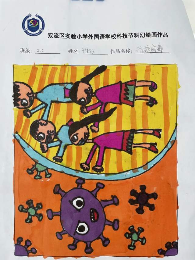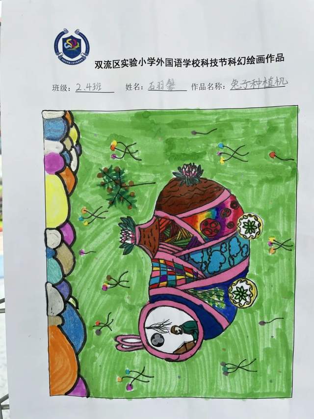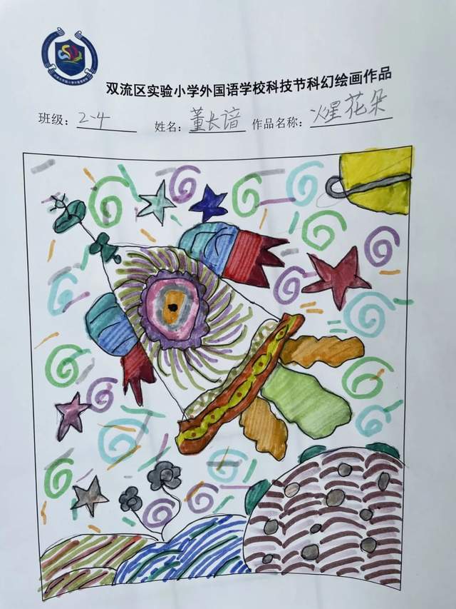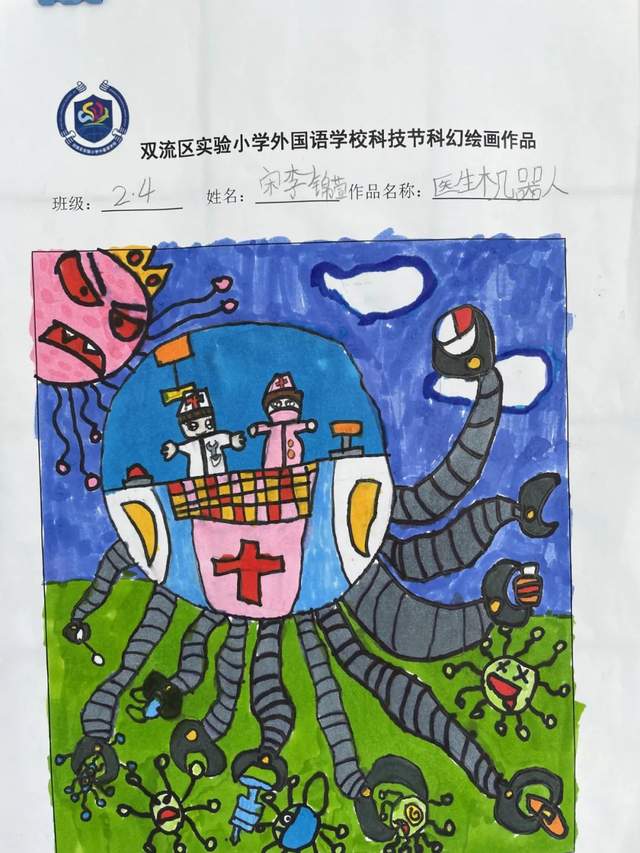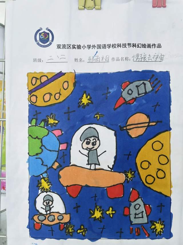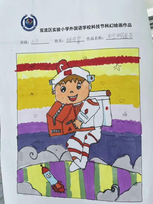 二年级的孩子们则是妙笔生花,在“奇妙科幻画”主题下彰显着自己独特的科技创想。画面中有星球的快递员,有未来世界,也有奇妙的快乐城等具有丰富想象力的蓝图。