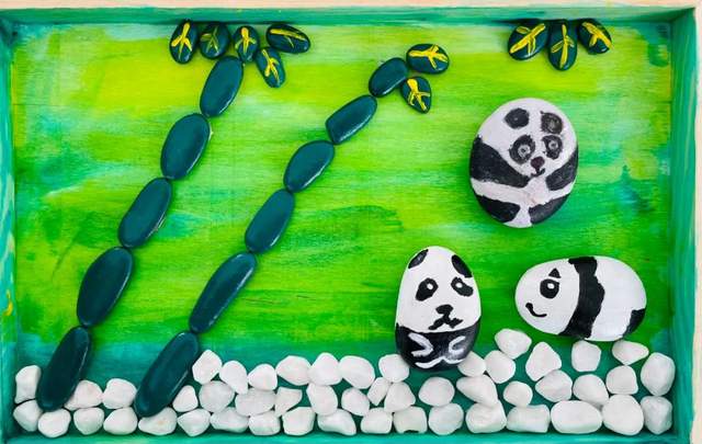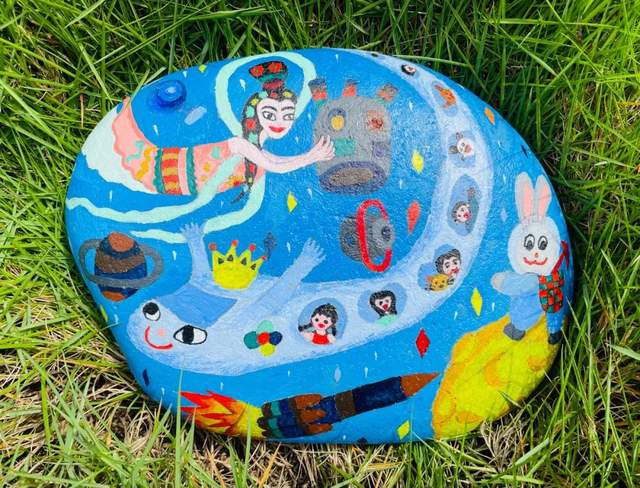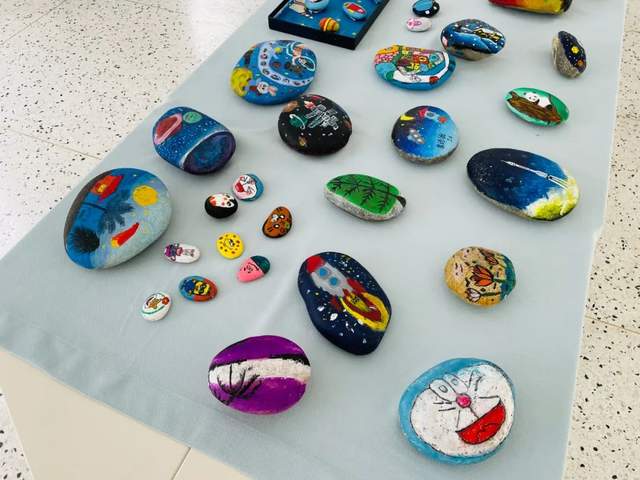 三年级“石头的世界”更是打开了新的艺术之门,才华横溢的能能娃们在石头上描绘对科学的探索。航天火箭、美妙星空、空中之城等创意作品琳琅满目,应有尽有。
